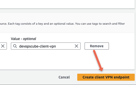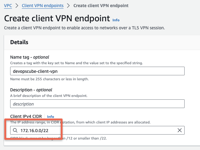 Provide name and description for the endpoint, and in the Client IPv4 CIDR, choose any CIDR value, that is different from the CIDR of the VPC in which you want to create the VPN endpoint. This is a specific range of IPv4 addresses that AWS will give to devices when they connect to your VPN