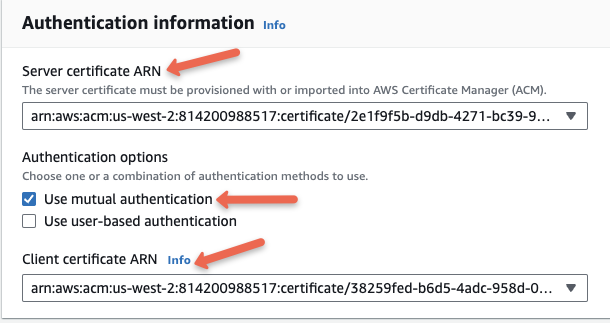 Under Authentication information, select the mutual authentication and select the appropriate server and client certificates we created in ACM.