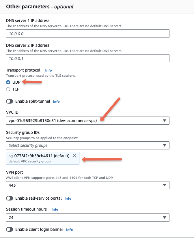 In Other parameters, we can configure DNS server details, Transport protocol types, Tunneling types, and more.