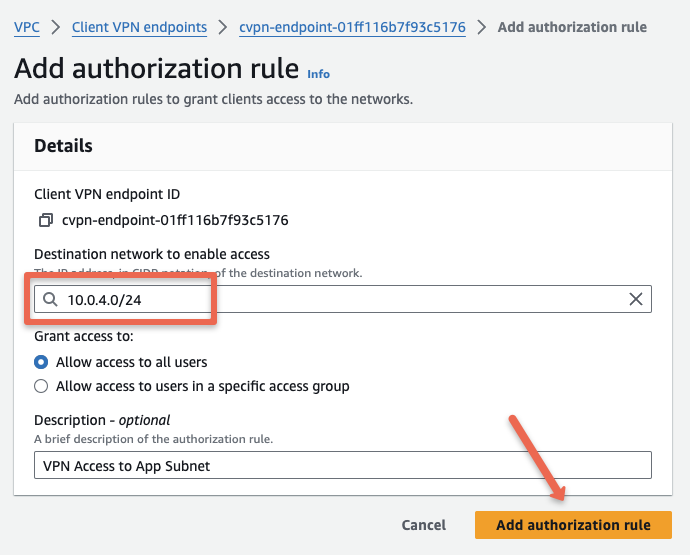 Step 5: Configure the authorization rule for the client VPN endpoint.