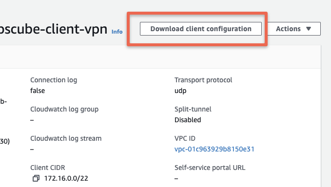 Enabling a self-service portal will help the clients download the client VPN endpoint configuration file and the client application from the browser. This feature is only applicable to user-based authentication.