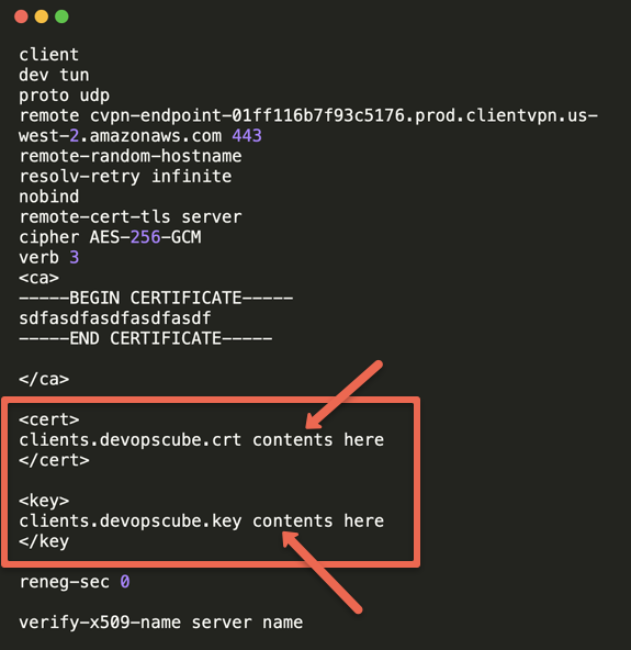 Open the downloaded configuration file in a text editor. We need to add the client certs, ie clients.devopscube.key and clients.devopscube.crt we created in the first step in the ~/certs folder. This is required becuase we opted for mutual SSL based VPN connectivity.