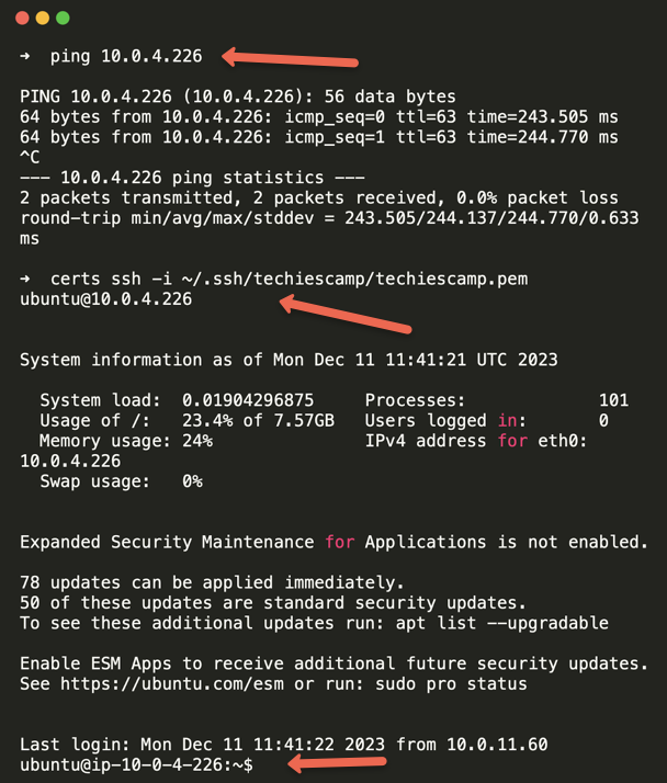 Now, we can communicate the remote server with its private IP address, as if we are connecting locally.