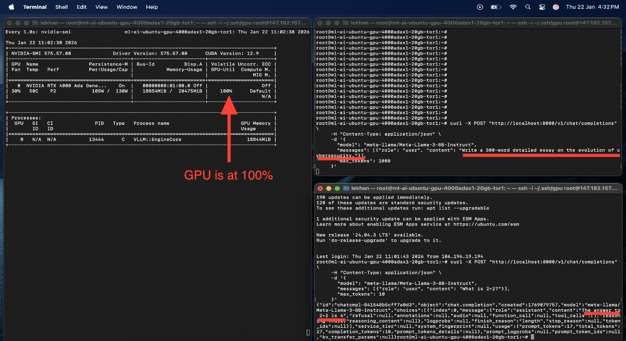 The following image shows the final deployment stack. Llama 3 8B instruct running inside a Docker container with NVIDIA runtime on an RTX 4000 ADA with 20 GB VRAM. vLLM has paged attention, and it manages VRAM allocation.