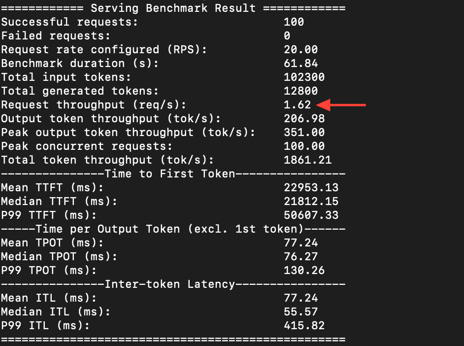 Test: 100 requests, 20 concurrent, against the standard FP16 model first