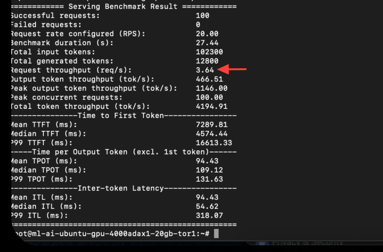 The FP 8 version was able to process 3.64 requests per second, while the FP 16 version could only do 1.62. The token generation speed also went from 206 to 466 per second.