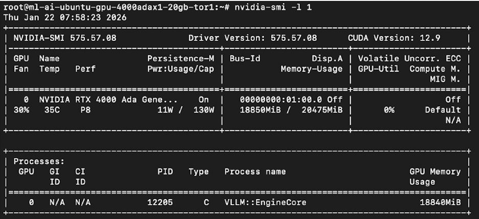 With the model loaded and no requests running, the GPU was already at 18,850 MiB of 20,475 MiB. That is over 92% full. The weights are loaded into VRAM on startup and stay there. The GPU looks full the whole time, even when idle.