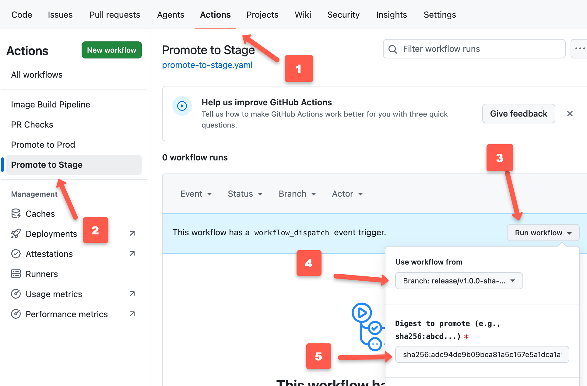 It will ask for the image's SHA ID, which you want to promote. Once you enter the ID, click the Run workflow button to start the job.