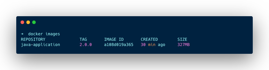 docker build -t java-application:2.0.0 .Use the docker images command to list your docker image as given below