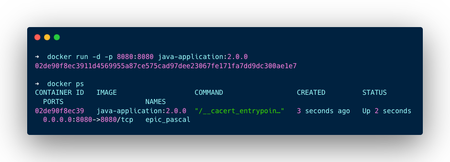 docker run -d -p 8080:8080 java-application:2.0.0This command will run your Java application in a container. Make sure to change the port if you are exposed to a different port.