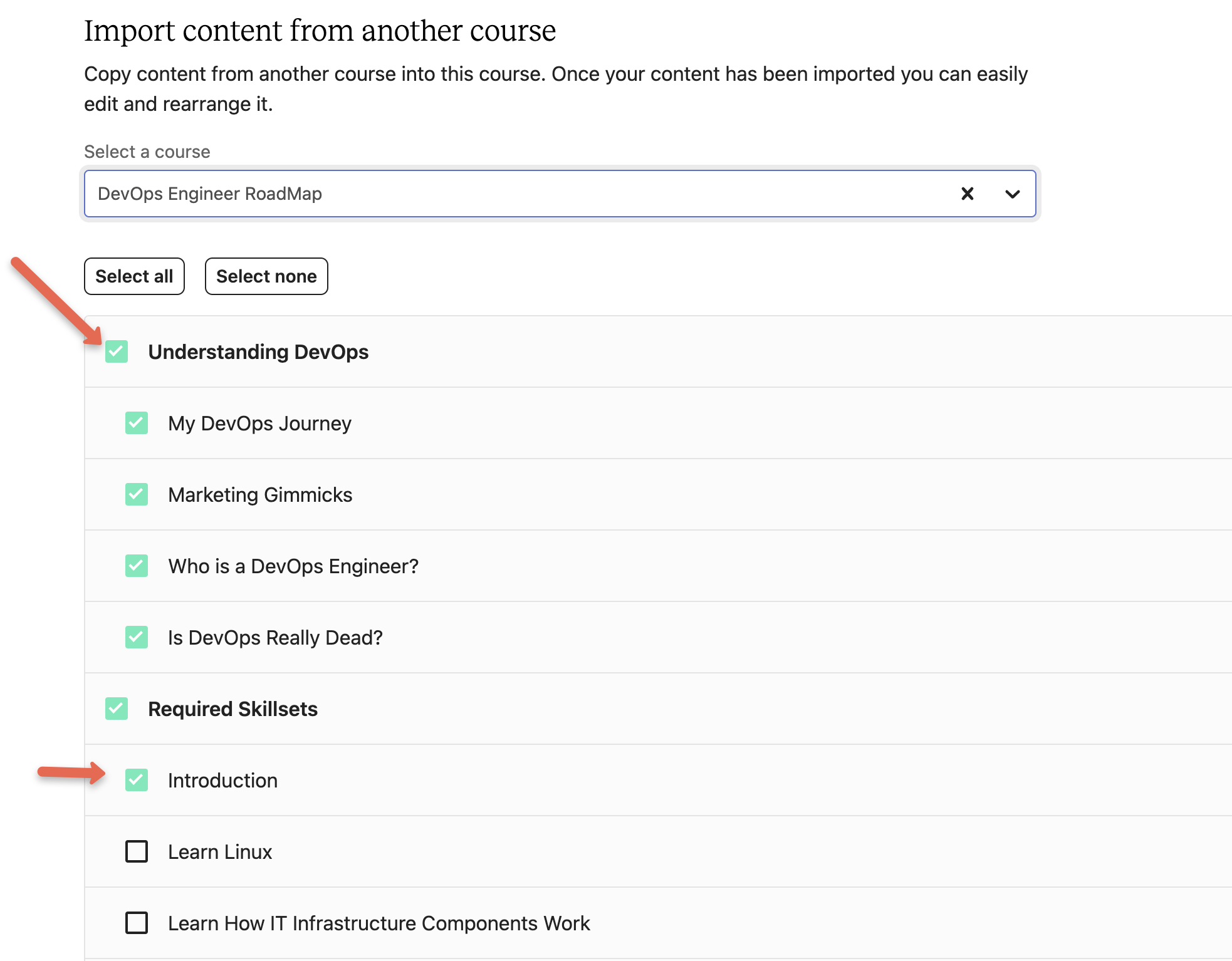 Now, you will see all the sections and lessons. You can pick and choose the sections and lessons you want to duplicate to your course.
