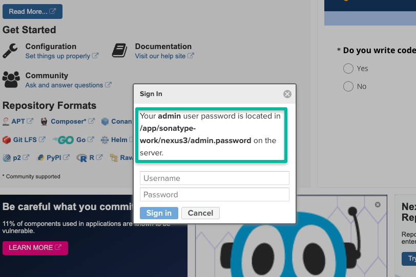 cat /app/sonatype-work/nexus3/admin.passwordOnce you login, you will be prompted to reset the password.
