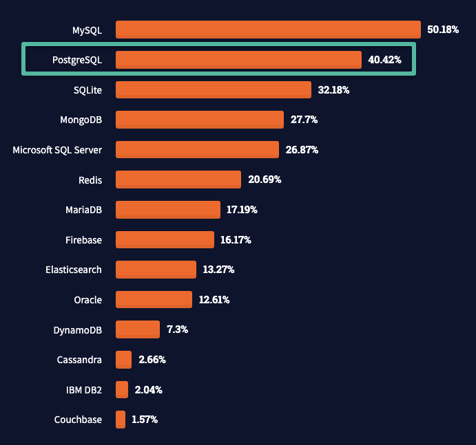 As per the latest StackOverflow developer survey, 40.42% of developers use PostgreSQL as a database.