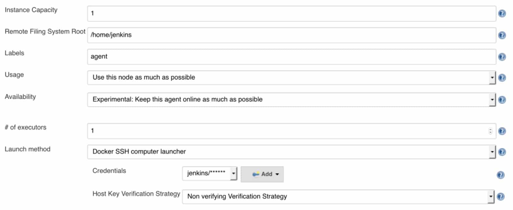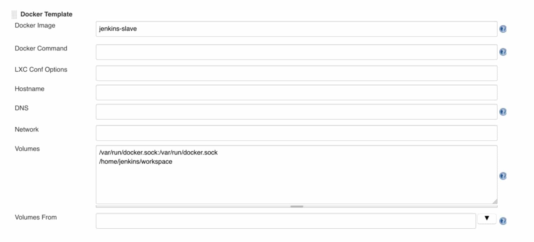 /home/jenkins/workspaceThe volumes are volume mappings that DockerPlugin will use to create slave containers. The first volume mapping mounts docker socket into the container to enable docker command can be listened by docker daemon on the host, the second line let Jenkins find her workspace to execute the job.