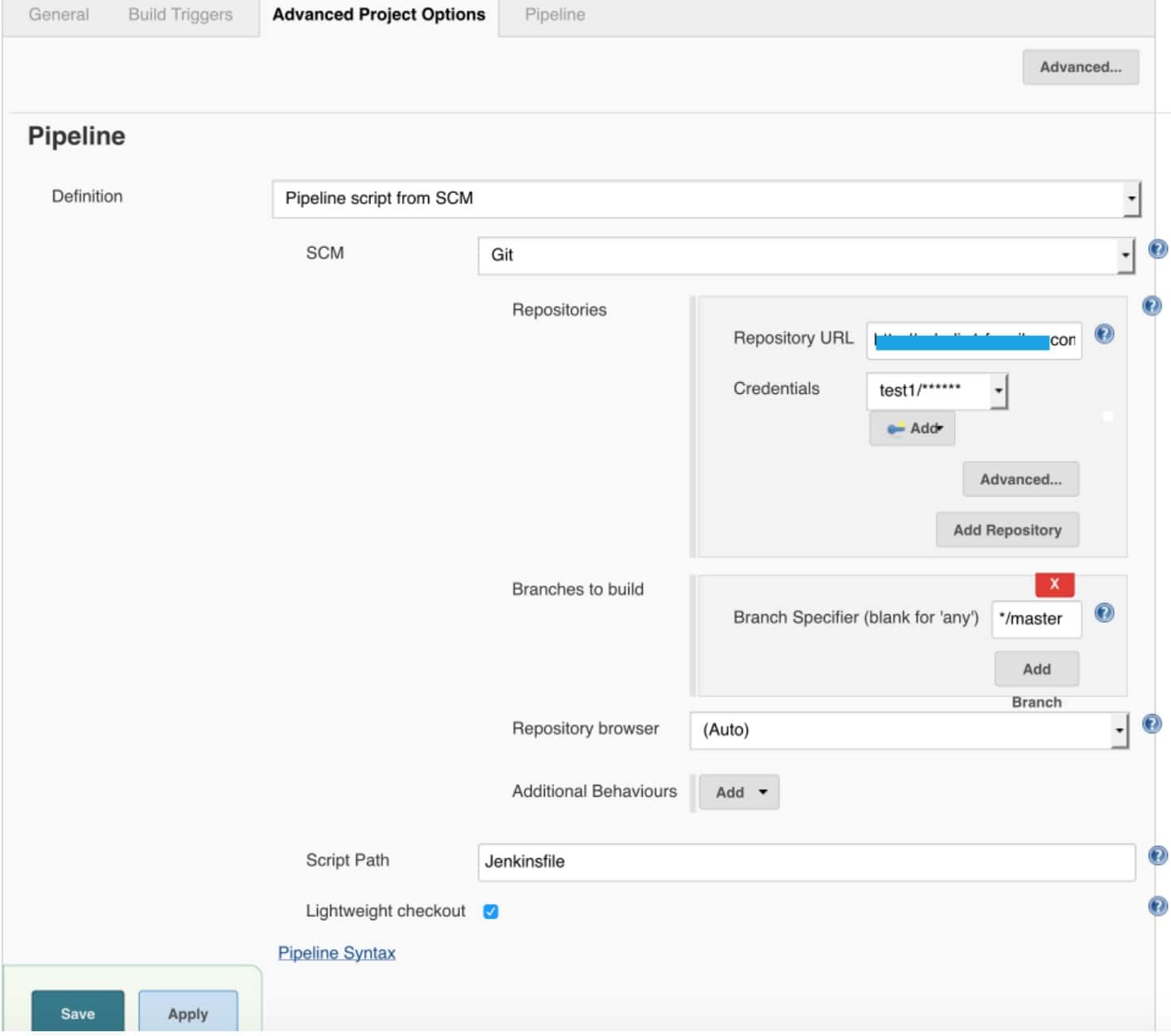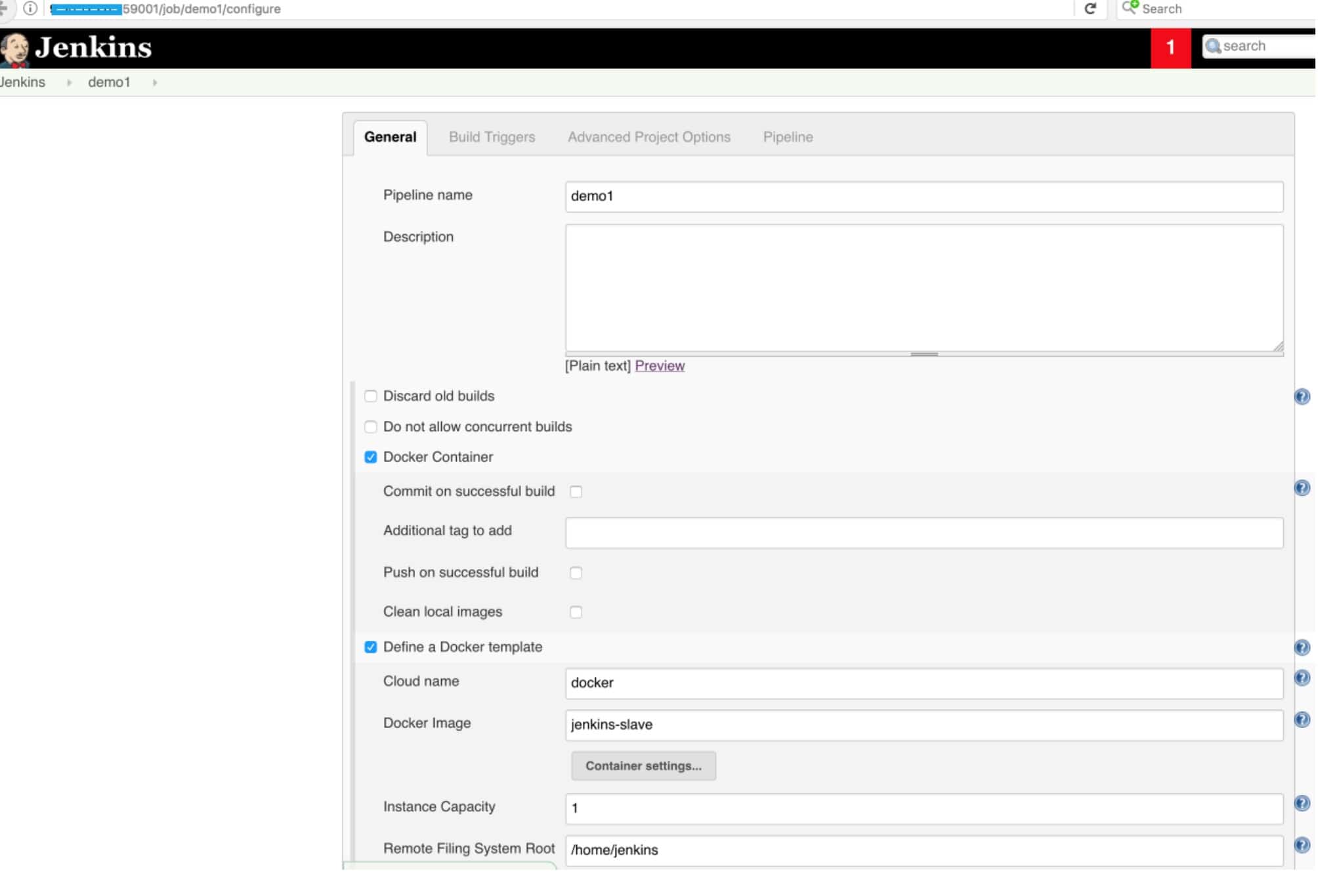 Now the docker slave configuration is complete. The whole configuration can be saved by committing the Jenkins image. To verify, you can create a job to run. Your Job configuration can be as below screenshots if you want a pipeline job in order to build from a repository (note your repository should contain a Jenkinsfile).