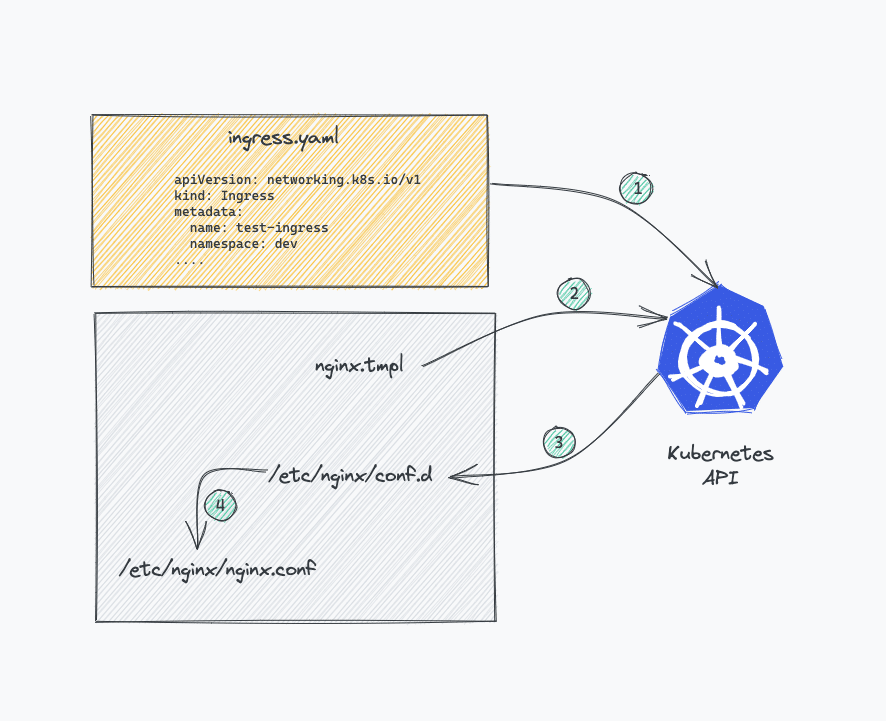 nginx.conffile inside the Nginx controller pod is a lua template that can talk to Kubernetes ingress API and get the latest values for traffic routing in real-time. Here is the template file. - The Nginx controller talks to Kubernetes ingress API to check if there is any rule created for traffic routing.