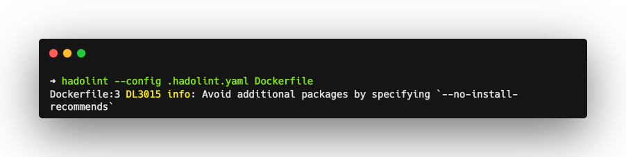 To use Hadolint, simply install it on your system and run the command with your Dockerfile. Hadolint will give a list of errors it finds in your Dockerfile as an output, along with a severity level and the cause of that problem.