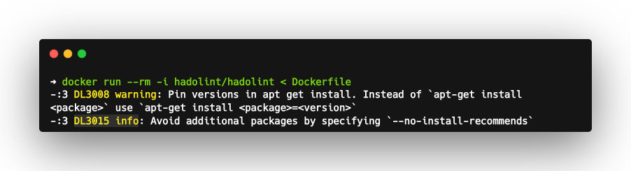 Linting Dockerfile is a good practice during development as in Infra pipelines. I highly suggest you add Hadolint as part of your Docker image build pipeline to have secure and optimized container images.