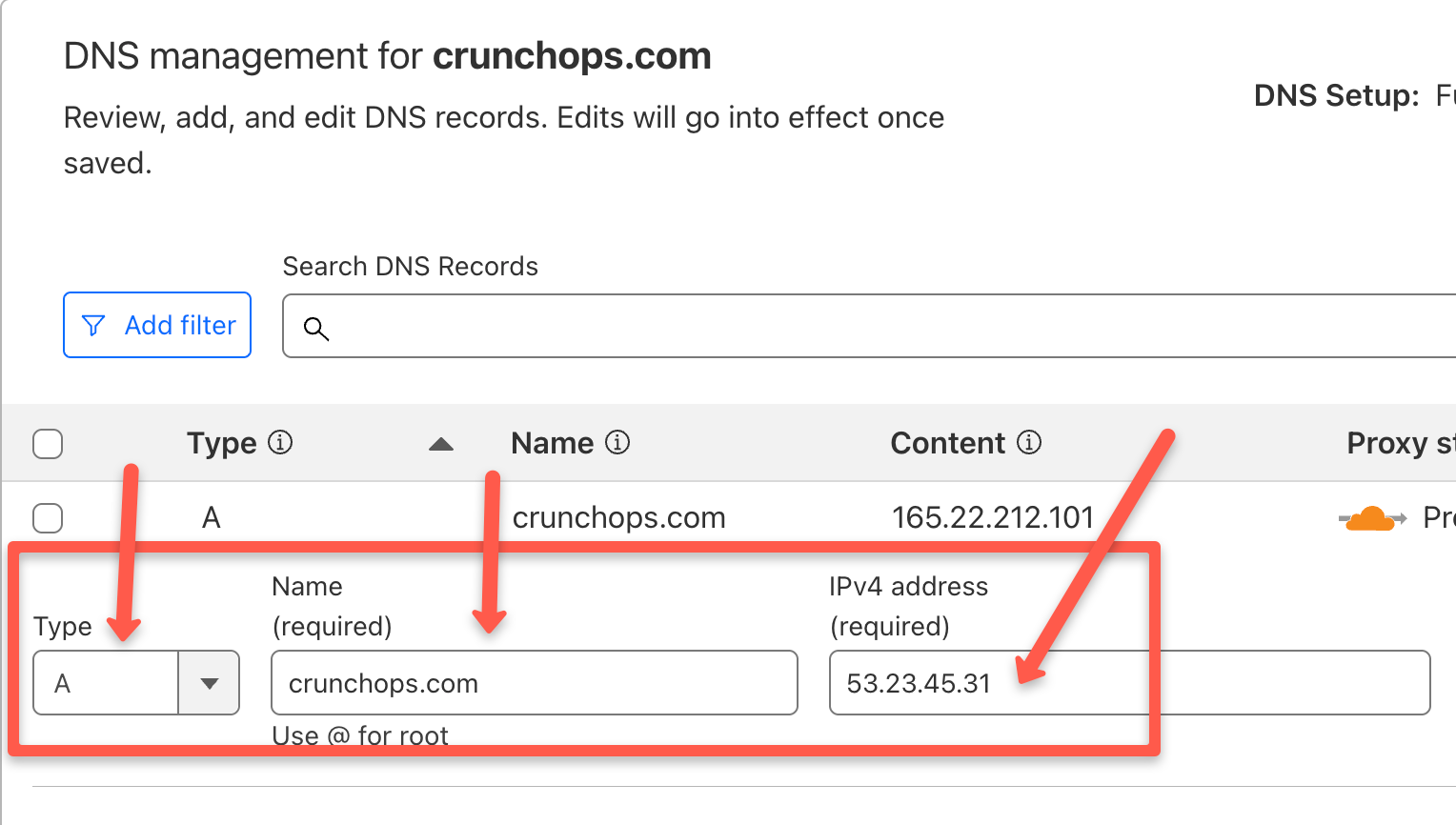 - Add an A record, which simply says: “When someone types mydomain.com, send them to this IP address (your Cloudways server IP).”