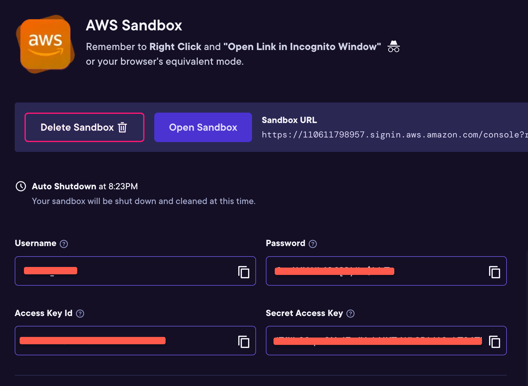 For example, you can create a temporary AWS account to practice what your learn. The following image shows the AWS sandbox details you get once you create it.