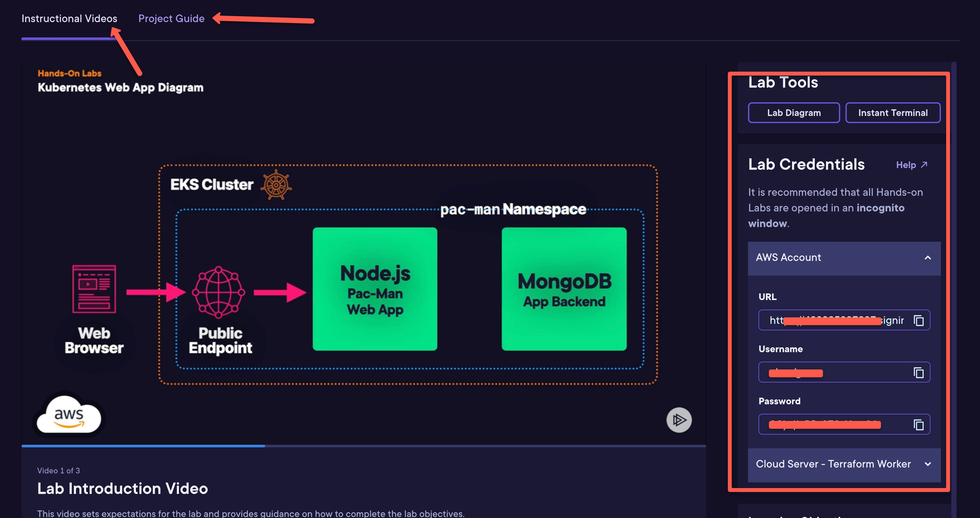 Once you start the lab, you will have access to the video, supportive project guide and lab credentials as shown below.
