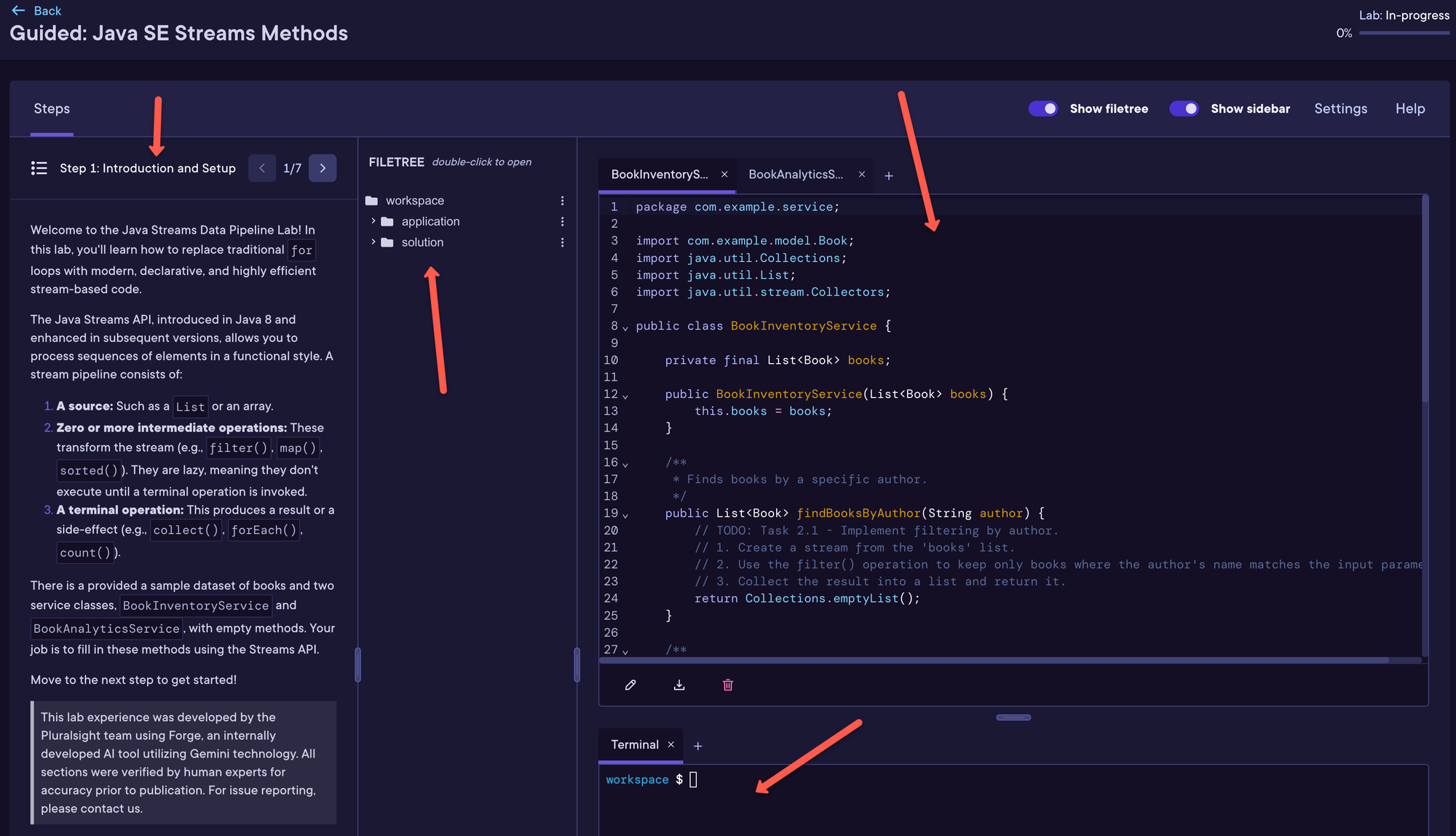 For programming labs, you get a integrated code editor and terminal like an IDE as shown below.