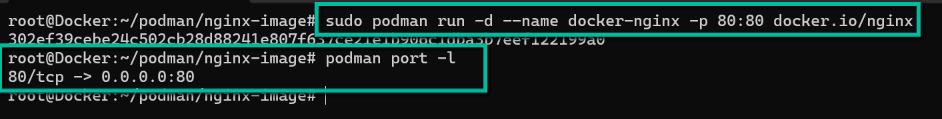 sudo podman run -d --name docker-nginx -p 80:80 docker.io/nginxYou can check the mapped port using the following command. -l flat returns the details for the latest container.