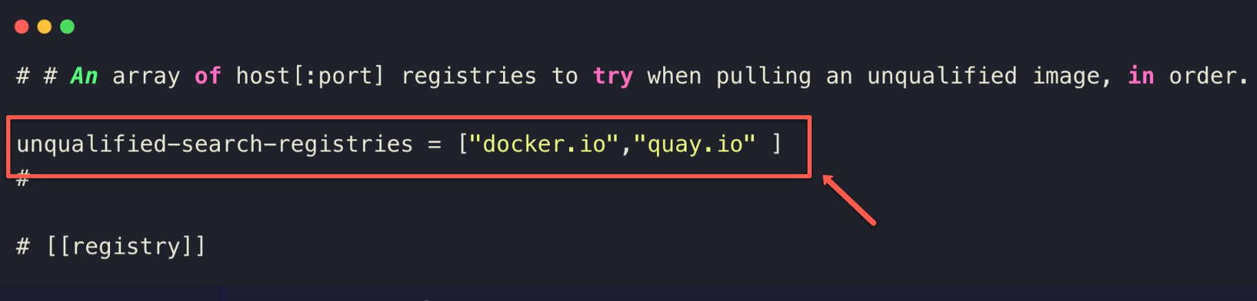 unqualified-search-registries field will be masked, so you need to unmask and add the registries such as docker.io , quay.io, etc.If you do not add the registries here, you need to give the full image name on the Dockerfile, for example,