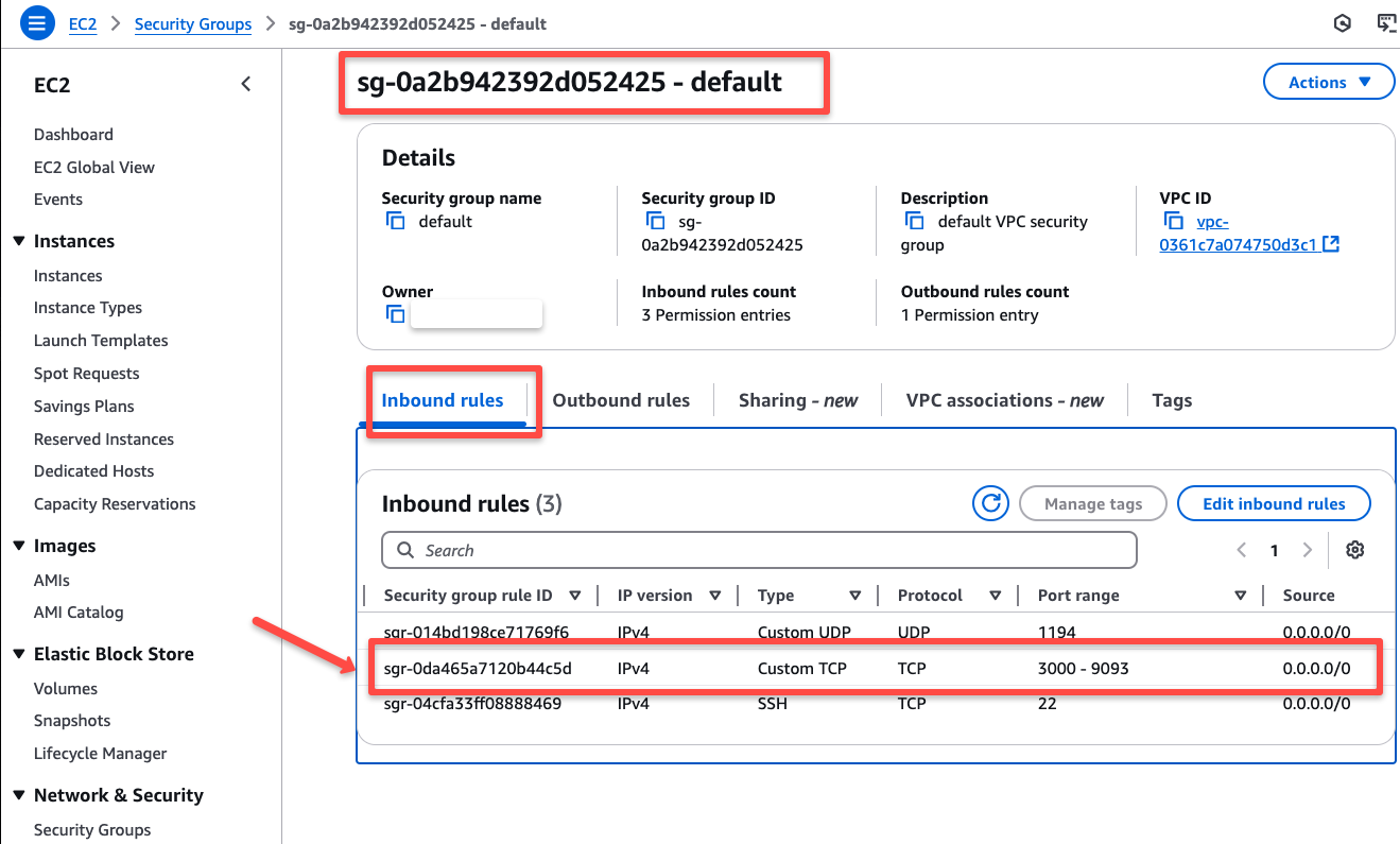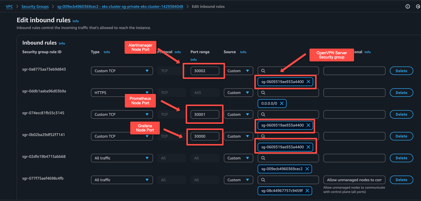 Need to add three inbound rules for Grafana (30000), Prometheus (30001), and Alertmanager (30002) NodePorts.