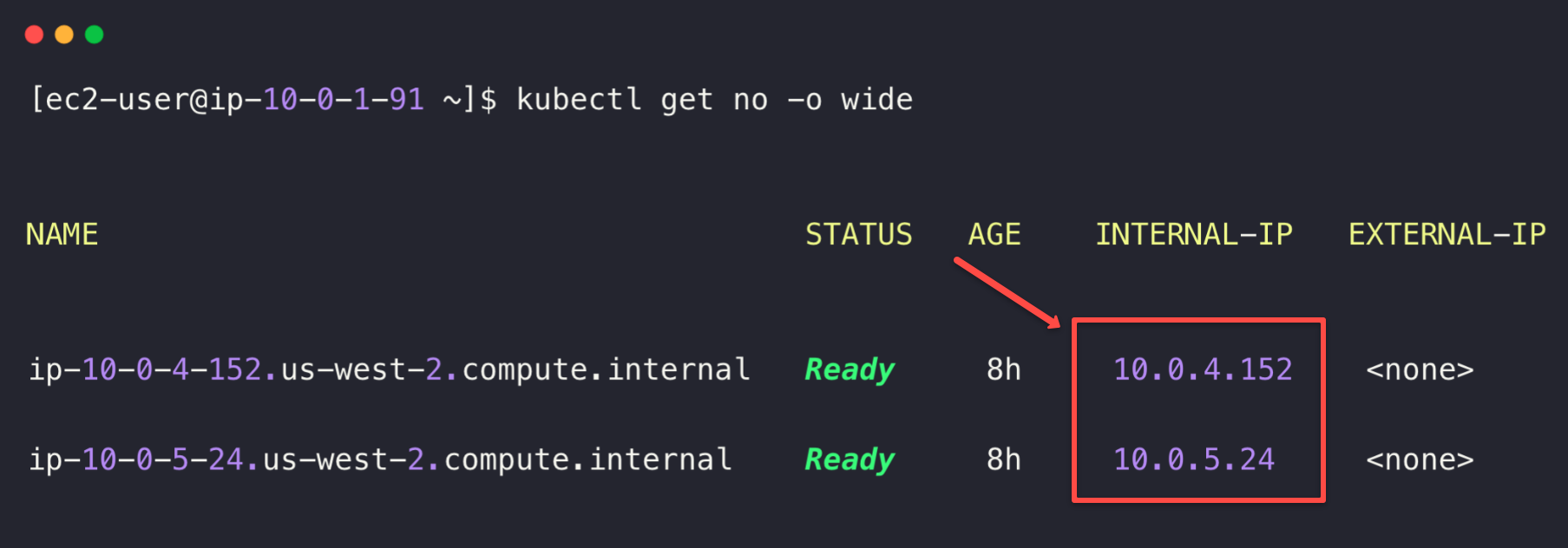To test the connection, we need any of the EKS cluster node's private IP and the NodePort number of the service.