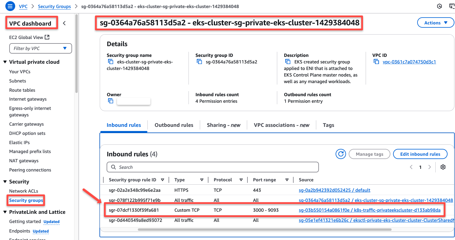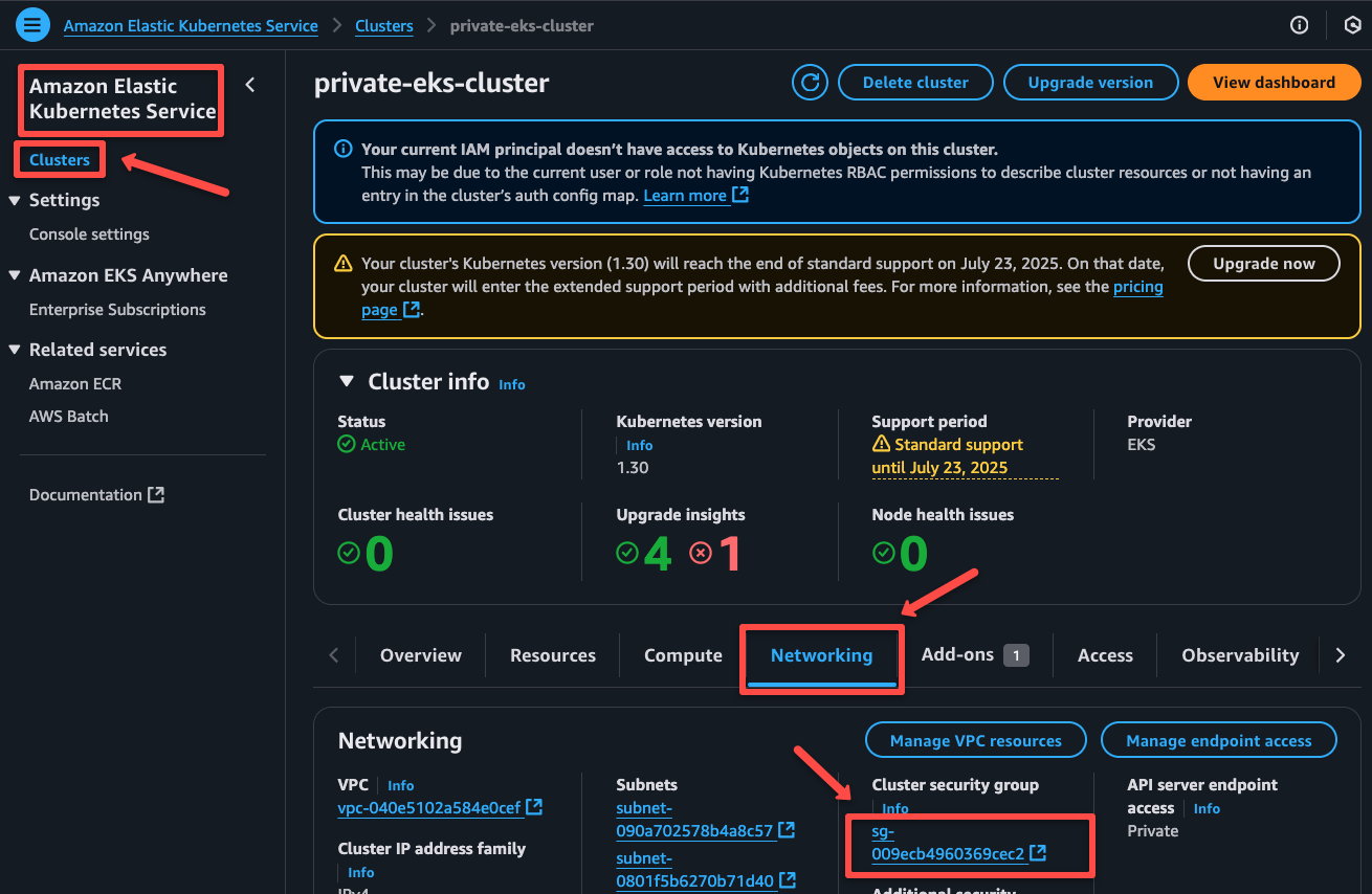 Navigate to the EKS dashboard and open the Networking section and click the cluster security group of the cluster.