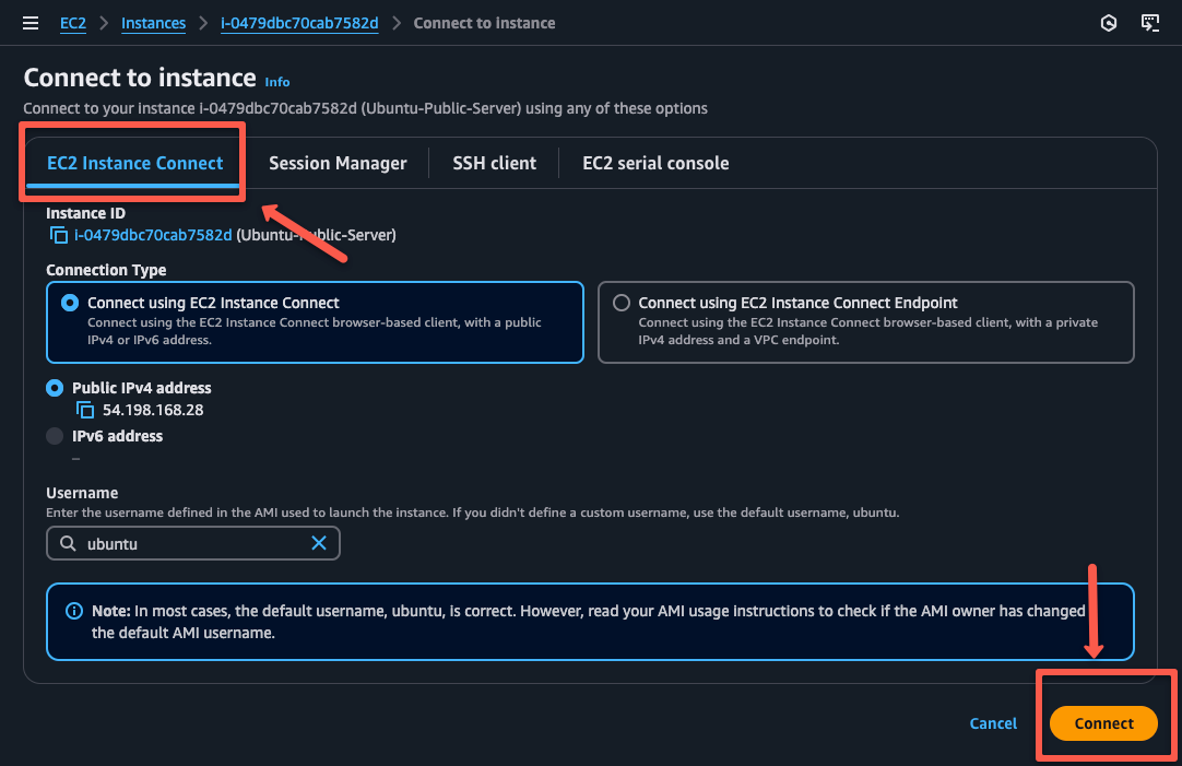 Select the EC2 Instance Connect option to connect the public server through the web terminal.
