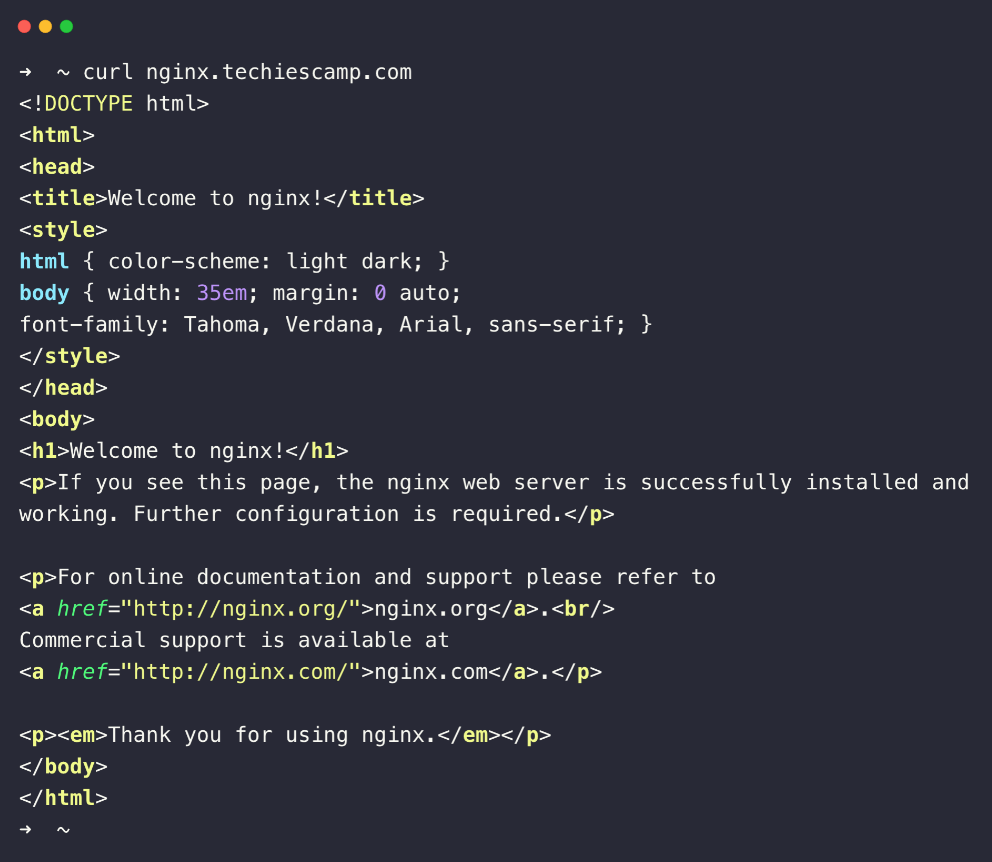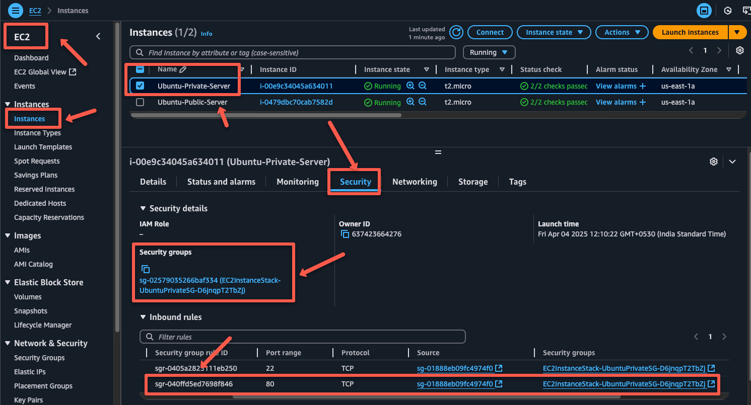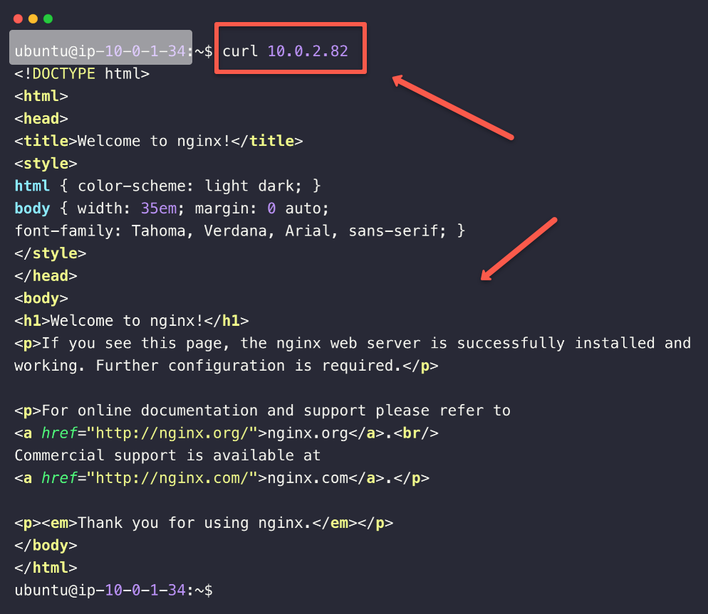 Once the security group rules are correctly set, we can access the private Nginx server from the public server using its private IP.