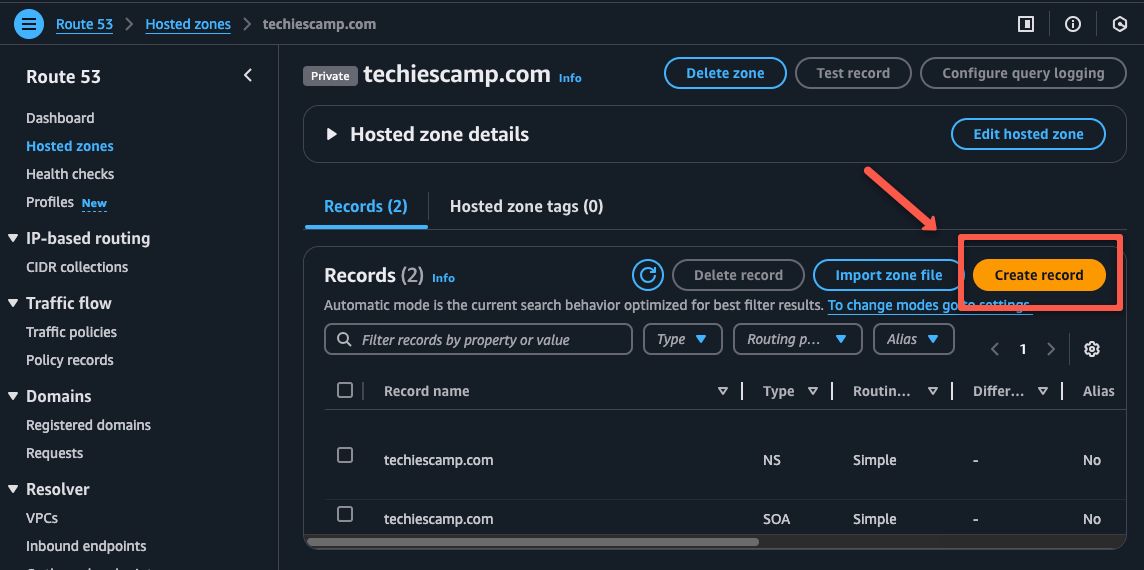 Once provide all the required information, click the Create hosted zone button to create the private hosted zone.