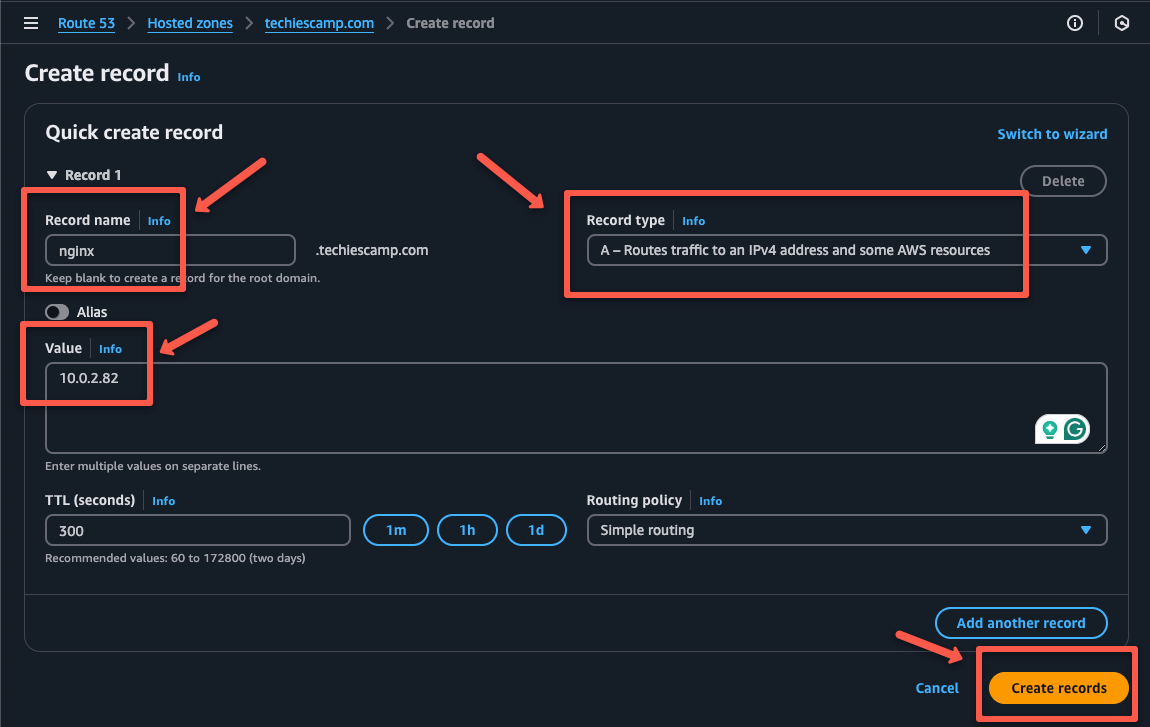 In the Value section, we need to add the IP of the private Nginx server, then click to Create records to create the record.