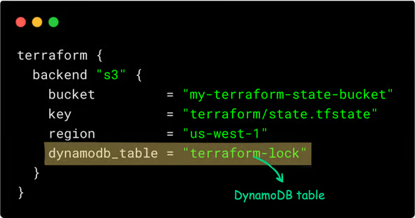 The Terraform backend configuration that uses DynamoDB for state looks like this: