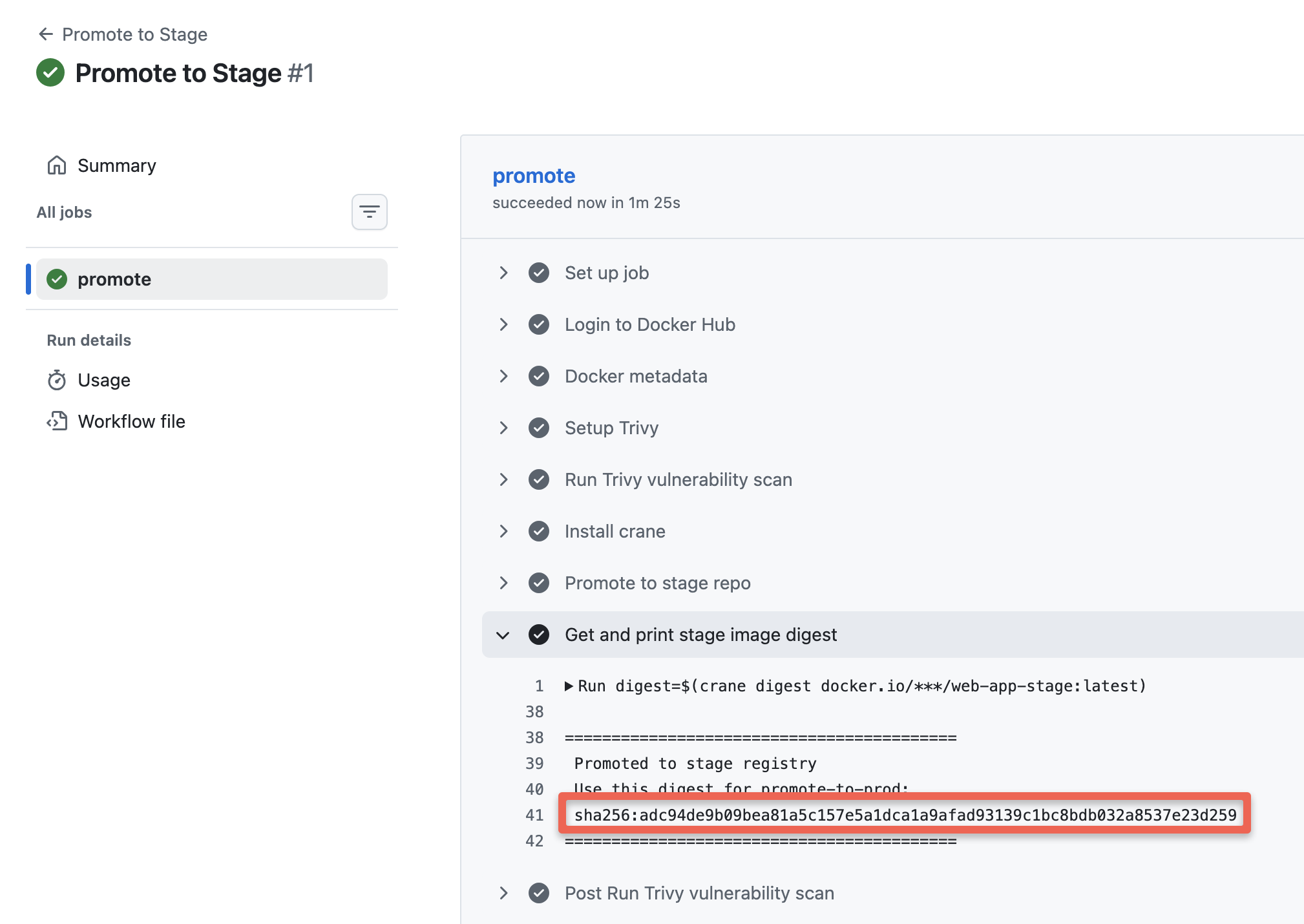 It will ask for the image's SHA ID, which you want to promote. Once you enter the ID, click the Run workflow button to start the job.